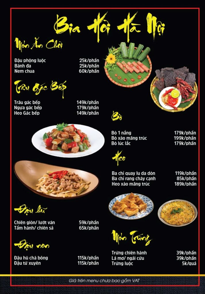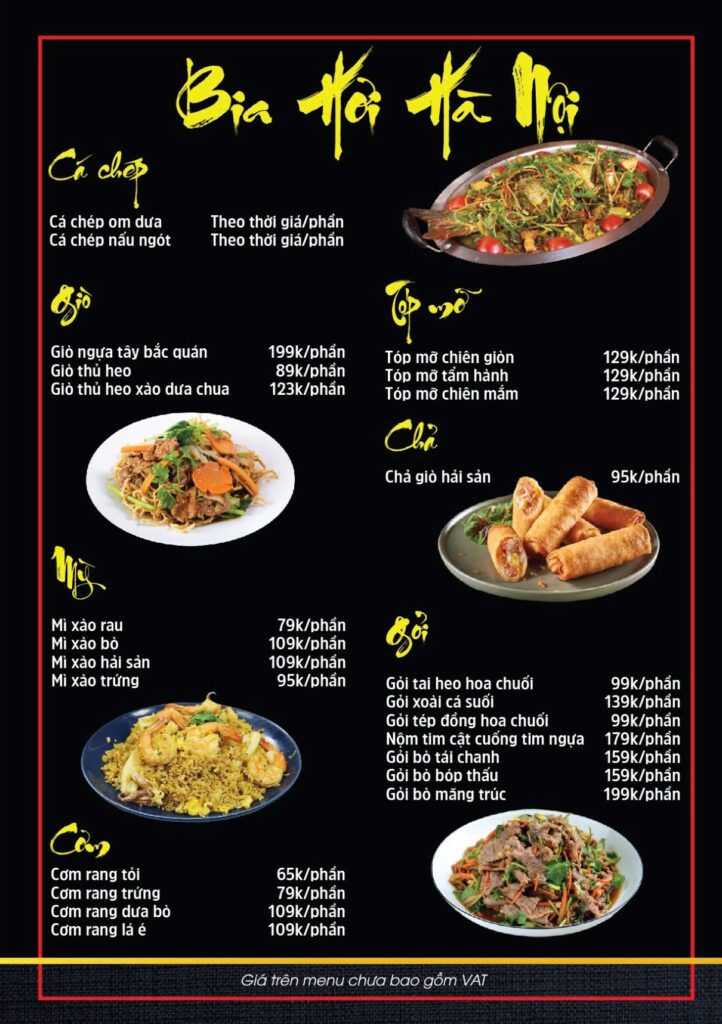 Thực đơn hấp dẫn của Nhà hàng Ẩm Thực Phố có gồm hơn 100 món ngon nhất cùng Bia Hơi Hà Nội Chất Lượng Chính Gốc. Phố Ẩm Thực có nhiều món ngon được chế biến từ Gà Đen Tươi Sống, Mẹt Heo, Mẹt Gà Ta, Cá tươi sống, là nơi ăn uống phù hợp cho gia đình, đoàn du lịch và thực khách địa phương.